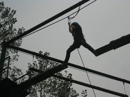 在个人挑战项目“攀岩”结束后,第一项团队训练项目是信任背摔,每一个队友爬上背摔的平台,在教练的指导下,捆住手臂,背对着团队向队友们用手臂搭建的“保护网”平倒。在一声声的“我现在遇到了困难,需要你们的帮助”、“时刻准备着”中,不仅能够感受到队友们的自信心,也能够感受到队友们对整个团队的信任。每个队友能够顺利的完成此项目,与其他队友的全心保护和自己对团队的高度信任分不开的。“信任是团队的粘合剂,是团队精神支柱。”如果要想使自己的人生更加精彩,更加快乐,那就充分在团队中展现自我吧!