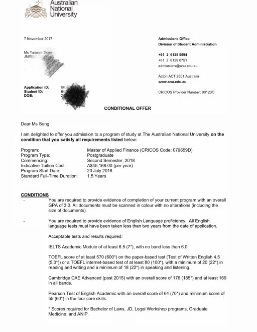 2018年5月,宋同学以优异成绩被澳洲国立大学金融硕士(澳洲第一,全球第十九)提前录取,将于