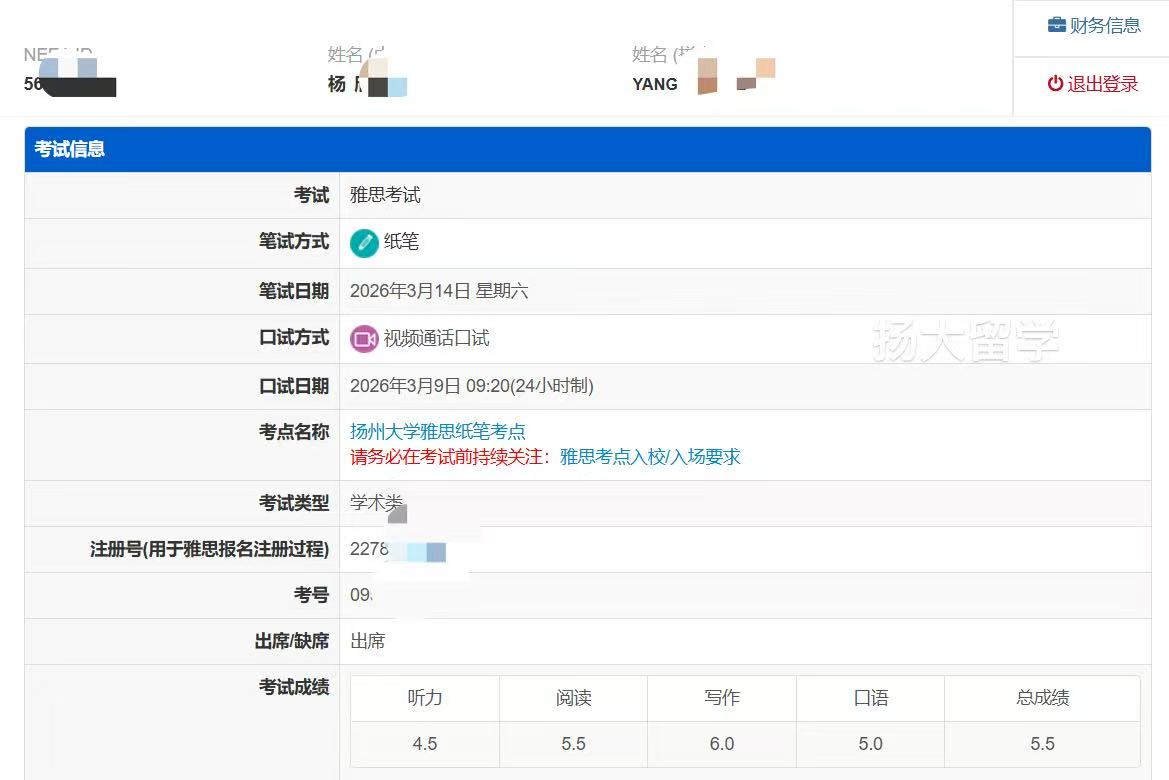 2026届杨同学四个月学习雅思初考就获得5.5分。